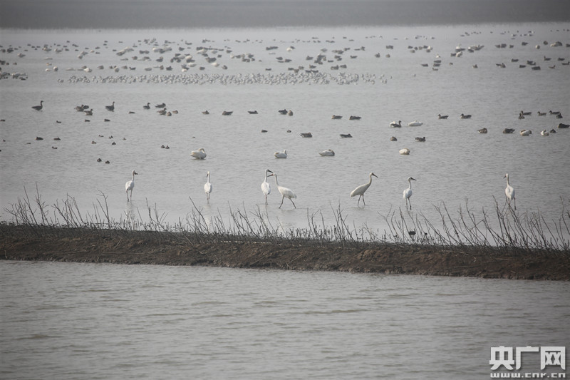 沉湖濕地拍攝到的7只白鶴,遠(yuǎn)處還有小天鵝、豆雁和反嘴鷸(央廣網(wǎng)發(fā) 武漢市蔡甸區(qū)沉湖濕地自然保護(hù)區(qū)管理局工程師馮江供圖)
