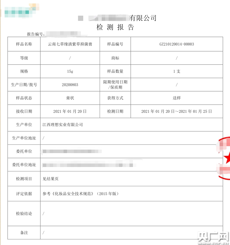 經(jīng)有檢測(cè)資質(zhì)的第三方機(jī)構(gòu)檢測(cè),確認(rèn)江西真潤(rùn)健康產(chǎn)業(yè)有限公司生產(chǎn)的七草兩葉抑菌膏含有丙酸氯倍他索,檢測(cè)含量達(dá)到24.08微克/克;白色粉末原料為丙酸氯倍他索,濃度達(dá)到92%。此次送檢的七草源抑菌膏中,未檢出丙酸氯倍他索。