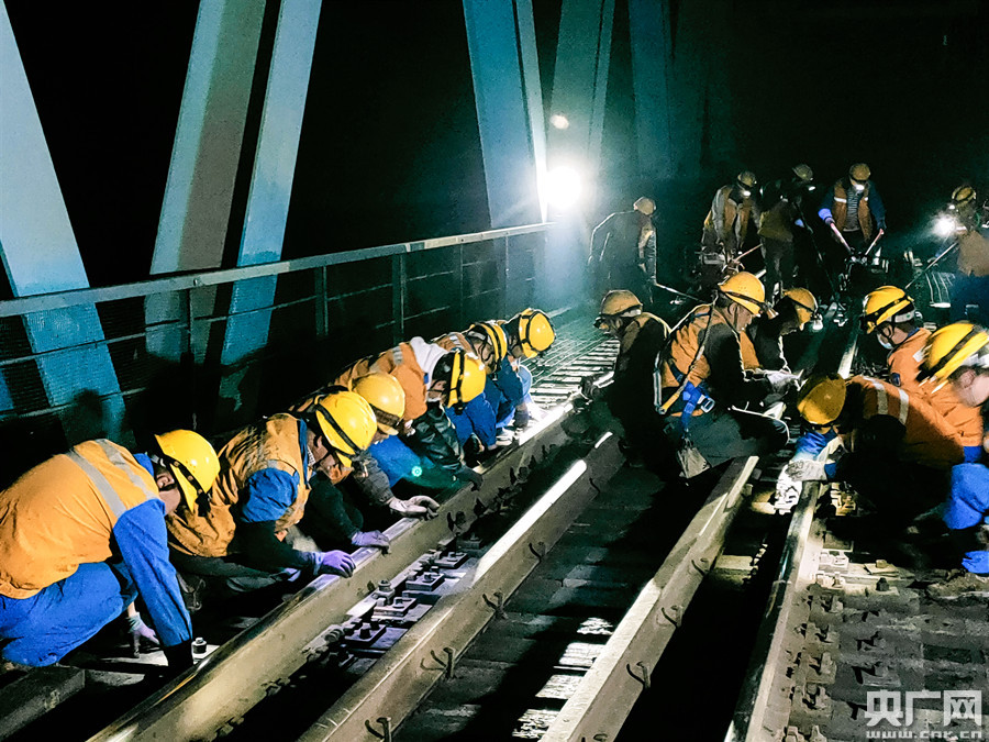 在近百米高的曲江大橋上,夜間氣溫已接近0℃,寒風刮得橋梁有些搖晃,這群鋼鐵漢子個個喘著白氣,頭上結了一層薄薄的冰霜,然而這一切絲毫沒有影響到他們的斗志!按蠹以偌影褎,檢查一下各自負責的工作,天窗時間還有20分鐘!卑子罎嵱庙懥恋暮艉奥曁嵝衙恳幻鳂I(yè)人員。23時40分,此次施工最后3顆橋枕更換完畢,封鎖線路正點開通。通過8個夜天窗的連續(xù)奮戰(zhàn),曲江大橋更換失效橋枕施工共計更換橋枕23顆、K型墊板7塊,橋枕膩縫500顆,護木整修160米。