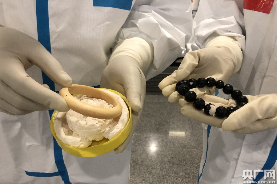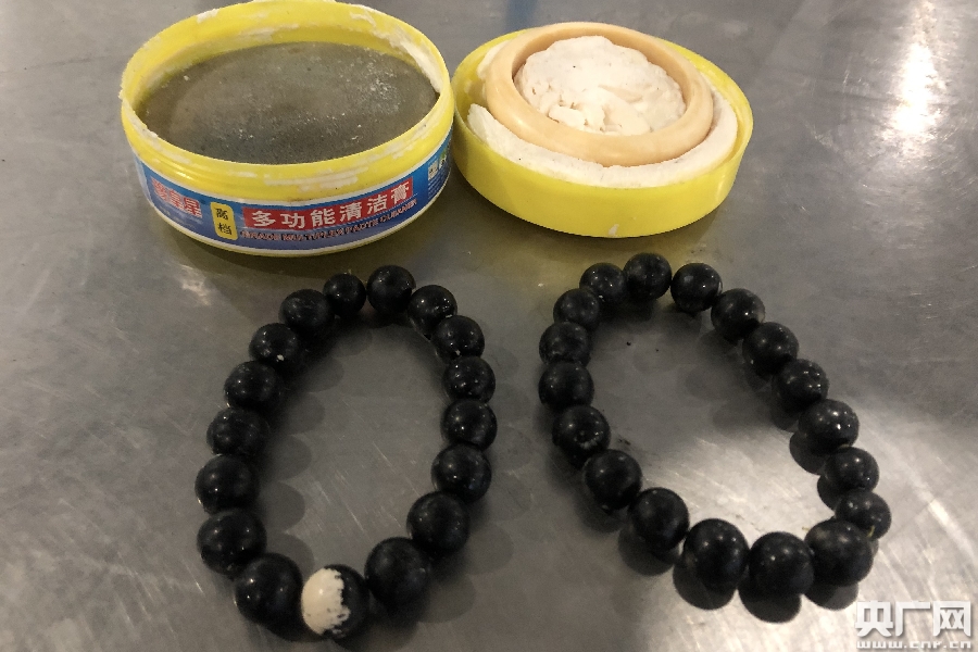 當日,現(xiàn)場關(guān)員在監(jiān)管自開羅入境航班時,發(fā)現(xiàn)一名旅客的托運行李機檢圖像存在異常。經(jīng)開箱查驗,發(fā)現(xiàn)2件黑色手串,旅客自述為非洲黑木手串,但質(zhì)感、顏色與常見木制手串存在差異。現(xiàn)場關(guān)員用刀輕刮手串表面,發(fā)現(xiàn)外層是黑色涂料,內(nèi)見乳白色質(zhì)地,從紋理判斷疑似象牙制品。在對該旅客所有行李物品進行徹底查驗后,又在一個多功能清潔膏盒子中查獲嵌在膏體中的疑似象牙手鐲1件。經(jīng)清點,該旅客共攜帶疑似象牙制品3件,重140克,其自述這些手鐲、手串是帶回國送給孩子的結(jié)婚禮物。隨后,現(xiàn)場關(guān)員又從同機另4名旅客托運行李中查獲疑似象牙制品14件,重470克。
