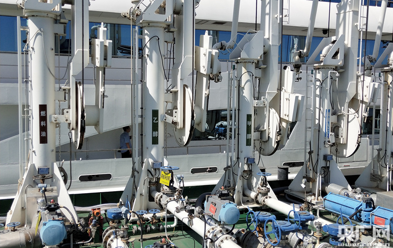 南京龍翔洗艙水接收轉(zhuǎn)運(yùn)碼頭,一排排管線正等待著裝載洗艙水的船舶停靠。(央廣網(wǎng)記者 黃炎秋 攝)