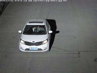據(jù)介紹,一張拍攝時(shí)間是13日下午6時(shí)45分,一輛白色起亞轎車在通過王英卡口時(shí),車輛停在路中央,駕駛員與坐在副駕駛座上的女子熱情接吻。