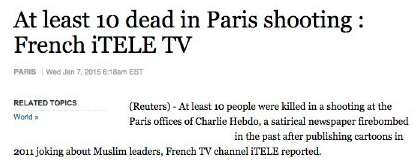 外媒:法國一諷刺雜志總部發(fā)生槍擊案 已致10死
