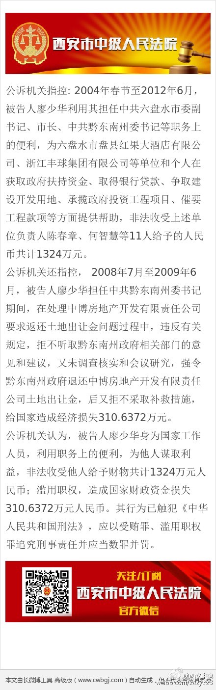 檢察機(jī)關(guān)指控,廖少華利用職務(wù)上的便利,為他人謀取利益,非法收受他人給予財(cái)物共計(jì)1324萬(wàn)元人民幣;濫用職權(quán),造成國(guó)家財(cái)政資金損失310.6372萬(wàn)元人民幣。