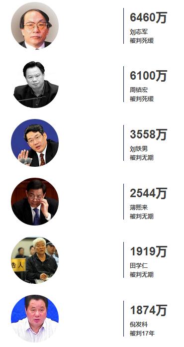 最高受賄6460萬元,最少被控283萬元