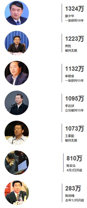 統(tǒng)計顯示,十八大后最終宣判并認(rèn)定貪腐金額的落馬官員有11人,分別是:原鐵道部長劉志軍,原政治局委員、重慶市委書記薄熙來,原國家發(fā)展和改革委員會副主任劉鐵男,山東省人民政府原副省長黃勝,原內(nèi)蒙古自治區(qū)黨委常委、統(tǒng)戰(zhàn)部部長王素毅,原廣西政協(xié)副主席、區(qū)總工會主席李達球,吉林原常務(wù)副省長,吉林銀行原黨委書記田學(xué)仁,原廣東省委常委、統(tǒng)戰(zhàn)部原部長周鎮(zhèn)宏,安徽省原副省長倪發(fā)科,原貴州省委常委、遵義市委書記廖少華、原江蘇省委常委、南京市市長季建業(yè)。湖北省政協(xié)原副主席陳伯槐,江西省人大常委會原副主任陳安眾2人已經(jīng)進入一審開庭審理程序。政知局小編根據(jù)判決書發(fā)現(xiàn),在這13名落馬高官中,2013年7月審判的原鐵道部部長劉志軍被認(rèn)定的受賄金額最高,達6460余萬元;金額最少的是已經(jīng)進入一審開庭審理程序的陳柏槐案,其此前職務(wù)為湖北省政協(xié)副主席,去年12月24日,陳伯槐濫用職權(quán)、受賄一案開庭,檢察機關(guān)共指控其受賄283萬元。