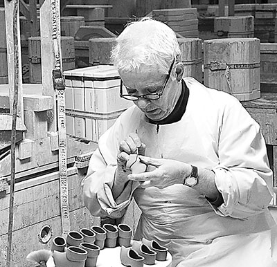 在荷蘭代爾夫特藍(lán)陶工廠,一名生產(chǎn)工人正在給著名的代爾夫特陶塑形。
