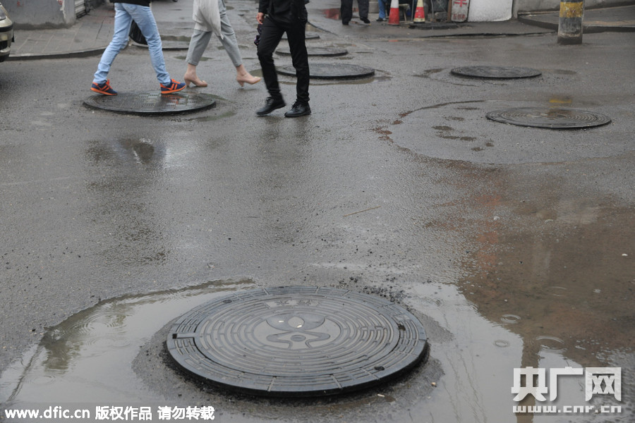 2015年4月28日,山東濟(jì)南,在濟(jì)南歷下區(qū)縣東巷中段,數(shù)十井蓋被拔高,由于密集排在路上,放學(xué)回家的家長騎車帶著孩子途徑此路,都要拐來拐去躲避障礙,如同考駕校“路考”。一位家長稱,此路附近有兩所學(xué)校,每天有數(shù)百學(xué)生要途徑此路上學(xué),雖然天氣暖和后,到了路面和橋面修缺補(bǔ)坑的時(shí)候,但放學(xué)路上存在安全隱患。