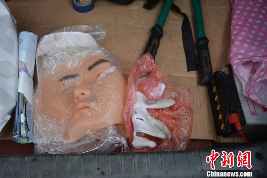 在查獲的作案車輛內(nèi),民警現(xiàn)場提取到口罩、假發(fā)、硅膠面具、電擊棍、匕首、手套、封口膠、約束帶、彈弓、望遠(yuǎn)鏡、假牌照等大量作案工具。