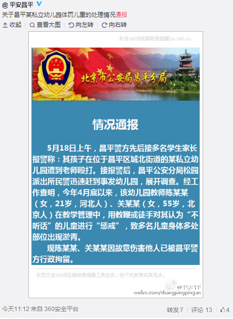 經(jīng)工作查明,今年4月以來(lái),該幼兒園教師陳某某(女,21歲,河北人)、關(guān)某某(女,55歲,北京人)在教學(xué)管理中,用教鞭或徒手對(duì)其認(rèn)為“不聽(tīng)話(huà)”的兒童進(jìn)行“懲戒”,致多名兒童身體多處部位出現(xiàn)淤青,F(xiàn)陳某某、關(guān)某某因故意傷害他人已被昌平警方行政拘留。