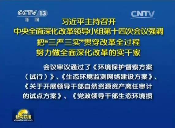 會議審議通過了《環(huán)境保護督察方案(試行)》、《生態(tài)環(huán)境監(jiān)測網(wǎng)絡建設方案》、《關于開展領導干部自然資源資產(chǎn)離任審計的試點方案》、《黨政領導干部生態(tài)環(huán)境損害責任追究辦法(試行)》、《關于推動國有文化企業(yè)把社會效益放在首位、實現(xiàn)社會效益和經(jīng)濟效益相統(tǒng)一的指導意見》。