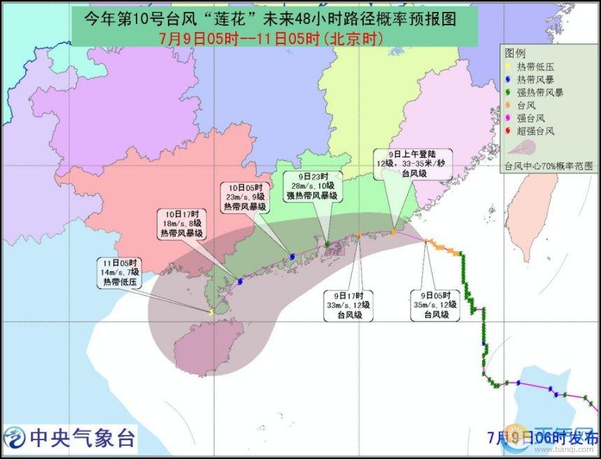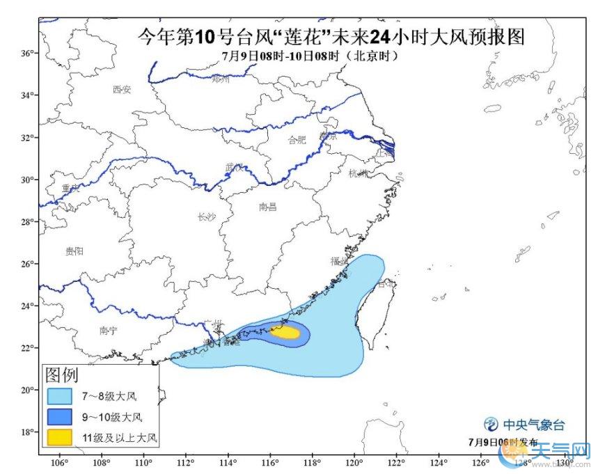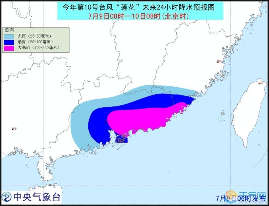 7月9日08時至7月10日08時,內(nèi)蒙古東部、四川盆地西北部、川西高原南部、云南中西部、湖北東部、江西南部、福建南部、廣東、臺灣等地的部分地區(qū)有中到大雨,其中,廣東東部、福建東南部、臺灣北部的部分地區(qū)有暴雨或大暴雨(100~220毫米),上述局地將伴有短時雷暴大風等強對流天氣。南海東北部有7~9級大風,“蓮花”中心經(jīng)過的附近海域風力10~12級、陣風13~14級。