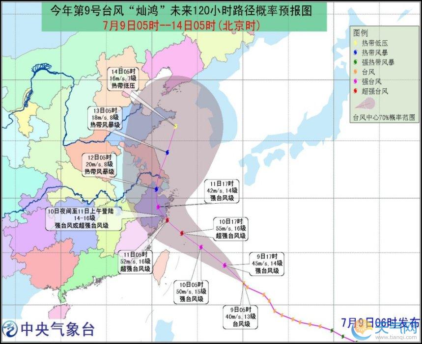 預計,“燦鴻”將以每小時20公里左右的速度向西偏北方向移動,強度繼續(xù)加強,將于10日白天進入東海東南部海面,最強可達超強臺風級(16-17級,52-58米/秒) ,然后逐漸向浙閩一帶沿海靠近,并有可能于10日夜間至11日上午登陸上述沿海地區(qū),登陸強度可達強臺風級或超強臺風級(14-16級,45-52米/秒)。