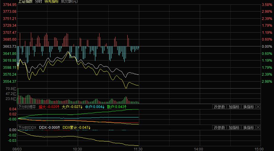 央廣網(wǎng)北京8月3日消息 周一,兩市低開后滬指圍繞3600點震蕩,至午盤滬指下跌2.43%,報3574.80點。