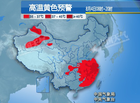 中央氣象臺預(yù)計,未來三天,受副熱帶高壓影響,黃淮南部、江淮、江漢、江南大部、華南東部及四川盆地東部等地將有35℃以上的高溫天氣,部分地區(qū)最高氣溫37~39℃,期間受冷空氣影響,5日開始,四川盆地東部和黃淮南部的高溫減弱。另外,新疆南疆盆地、吐魯番盆地和準(zhǔn)噶爾盆地南部等地有35℃以上的高溫天氣,部分地區(qū)最高氣溫37~39℃,吐魯番盆地可達(dá)40~42℃。為此,中央氣象臺8月4日06時繼續(xù)發(fā)布高溫黃色預(yù)警。
