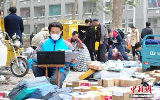 資料圖:11月11日,中國(guó)民眾每年一度的購(gòu)物狂潮大幕開(kāi)啟,濟(jì)南快遞業(yè)“同城快遞”率先啟動(dòng)投送熱浪,濟(jì)南一高?旒渌图械?cái)[滿學(xué)生們的購(gòu)物快件,取件學(xué)生絡(luò)繹不絕。 中新社記者 張勇 攝