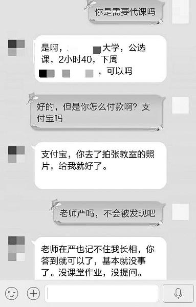 高校學(xué)生花錢雇人代自己上課,英語(yǔ)等公共課是“重災(zāi)區(qū)”,有的學(xué)生甚至一學(xué)期都找人代課。有需求就有市場(chǎng),一些在校生覺(jué)得兼職“代課”很輕松、來(lái)錢又快,他們?cè)谖⑿拧Q群上交流,每周代四五節(jié)課,一個(gè)月收入近千元。