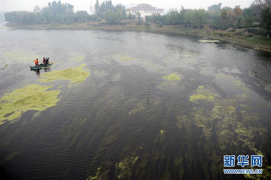 在河南省新鄉(xiāng)市境內(nèi)的海河支流,工作人員在河面清理水草(2015年11月5日攝)。新華社記者王益亮攝