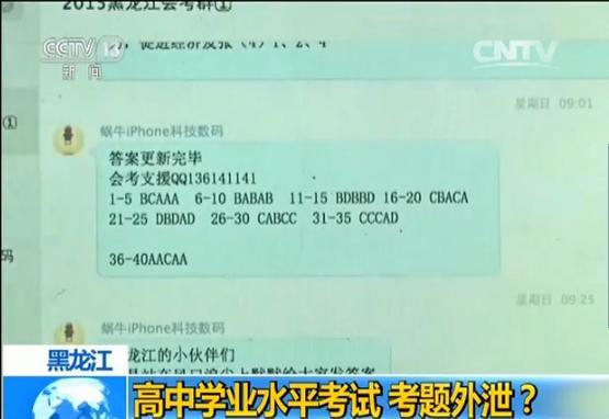 根據(jù)教育部相關(guān)文件,考試期間通過(guò)手機(jī)等通訊設(shè)備傳輸答案要受到嚴(yán)厲處罰;相關(guān)部門(mén)也稱此次考試采取了嚴(yán)格措施。那么在上千人的幾個(gè)QQ群里瘋傳的,真是這次黑龍江普通高中學(xué)業(yè)水平考試的試題和答案嗎?