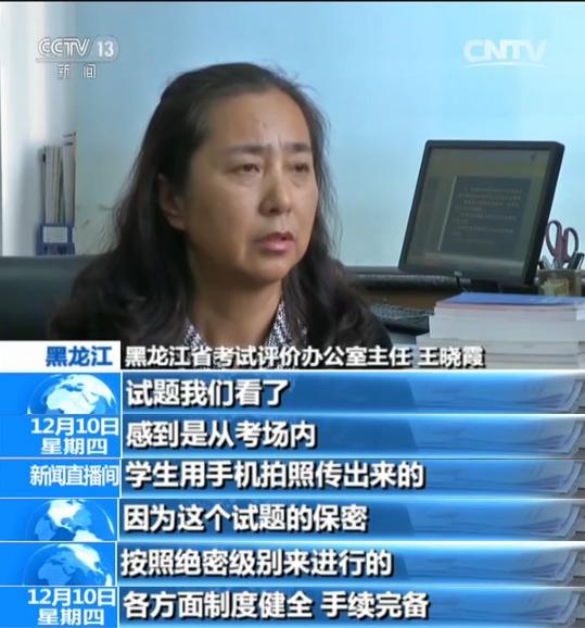 黑龍江省考試評(píng)價(jià)辦公室主任王曉霞:試題傳出當(dāng)天,我們做了初步判斷,認(rèn)為是考場(chǎng)內(nèi)學(xué)生用手機(jī)拍照傳出來(lái)的。