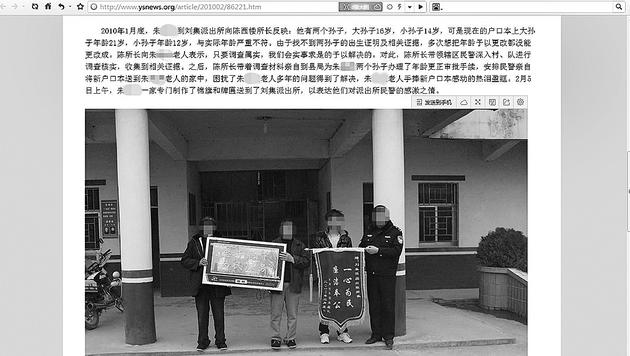 潁上縣政府網(wǎng)站上至今還掛著一篇表?yè)P(yáng)稿,其中包括已調(diào)任劉集派出所所長(zhǎng)的陳西樓為村民朱某的兩個(gè)孫子更改戶口信息一事。