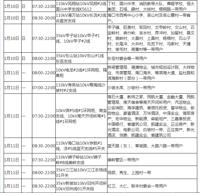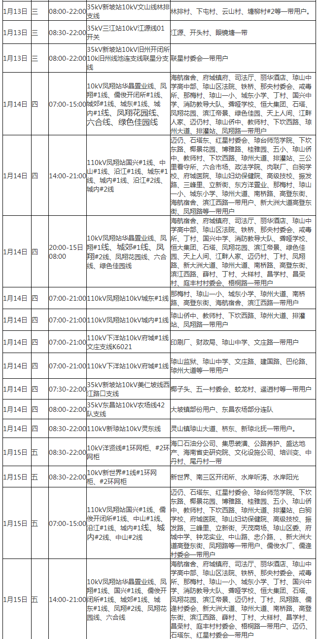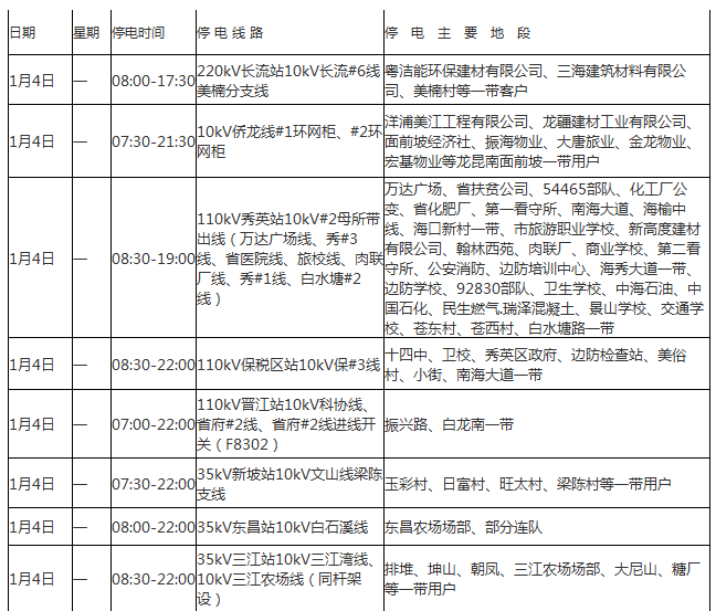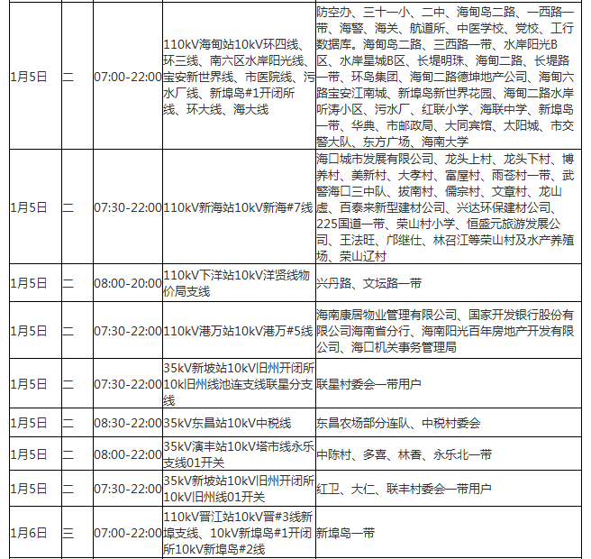 ?诰W12月27日消息(記者光明)海口供電局今天發(fā)布2016年1月4日至20日停電公告,以進行供電線路改造升級、設備消缺維護。海口部分居民用電將受到影響,請?zhí)崆白龊脺蕚洹?/p>