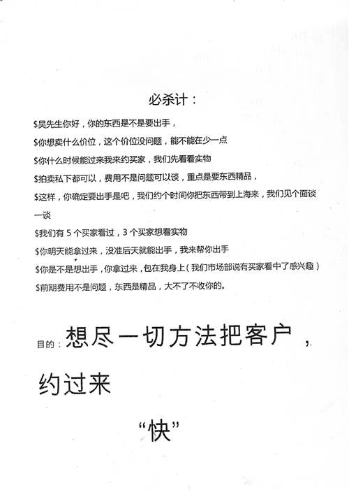 除了對(duì)外宣傳,該公司還雇傭了大量員工,通過(guò)網(wǎng)絡(luò)論壇、電話或微信尋覓被害人,用免費(fèi)展示、高價(jià)代售等方式吸引了不少收藏愛(ài)好者。據(jù)事后了解,該公司給每位員工提供一份“話術(shù)單”,上面一步步地注明了如何招攬客戶,只要按照話術(shù)單操作,成功率能大大提高。
