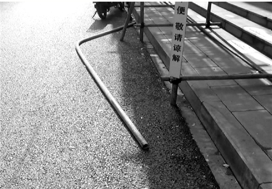 其實小葉是被橫臥在非機動車道上的一根鋼管絆倒了。昨天中午,錢報記者在事發(fā)現(xiàn)場找到了那根鋼管。被電動車撞到的鋼管已經(jīng)折成90度,而一旁綠化帶欄桿上也有明顯的碰撞痕跡!