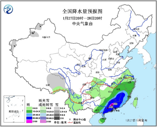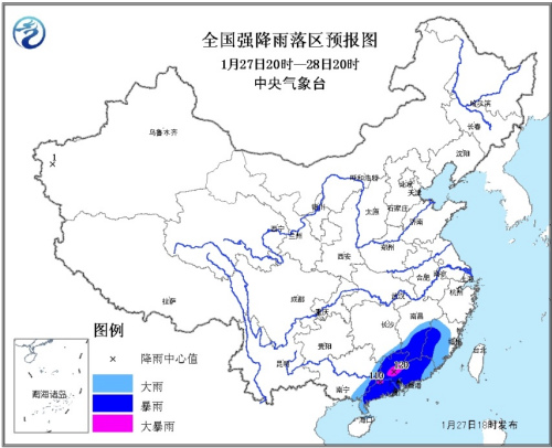 受南支槽和偏南暖濕氣流共同影響,預(yù)計(jì)27日20時(shí)至28日20時(shí),廣西東部、廣東、江西南部以及福建大部等地有大雨或暴雨,其中,廣東中北部的局部地區(qū)有大暴雨(100~120毫米);上述地區(qū)最大小時(shí)雨強(qiáng)可達(dá)20~30毫米。為此,中央氣象臺1月27日18時(shí)發(fā)布暴雨藍(lán)色預(yù)警。