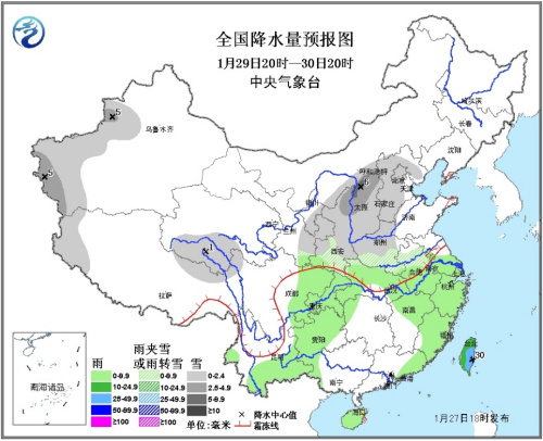29日20時(shí)至30日20時(shí),新疆西部、西藏西北部和東北部、青海南部、西北地區(qū)東部、華北大部、江漢北部、黃淮西部等地有小到中雪或雨夾雪,局地有大雪;西南地區(qū)東部、云南南部、江淮南部、江南東部、廣東東部、海南、臺灣等地的部分地區(qū)有小到中雨,局地大雨。山東半島、遼東半島等地有4~6級風(fēng)。