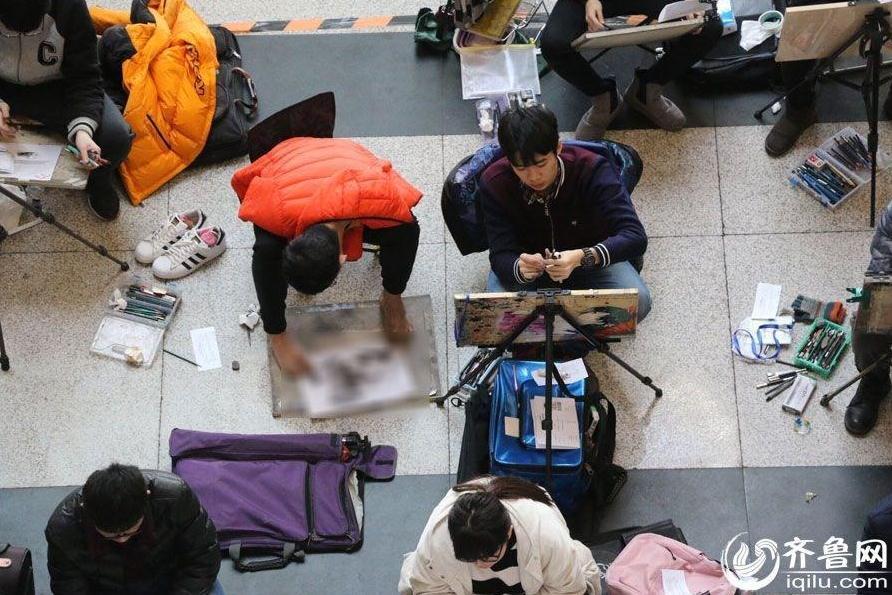 2月16日,2016年山東省藝考?颊嚼_帷幕,在濟南舜耕國際會展中心美術類專業(yè)考場,一位用腳畫畫的學生引起了記者注意。與其他考生不同的是,他的畫板沒有放在支架上,而是直接放在考場大理石地面上,今天的最高氣溫只有8度,這位考生赤著雙腳完成了考試。圖為一位考生用腳畫畫。 白少光 攝 圖片來源:齊魯網(wǎng)
