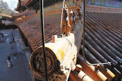 排云殿西北角屋脊邊緣一尊“騎鳳仙人”神獸消失,園方稱為復(fù)制品,現(xiàn)已重新添配,原件存于庫房