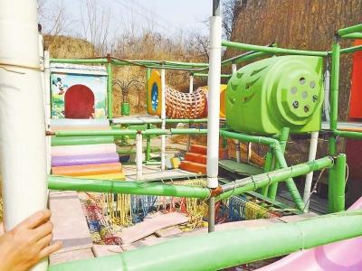 接到讀者報料后,記者當天上午就找到了蝴蝶谷體育公園。它位于鄭州尖崗水庫西側(cè)金蝶路旁,與婁河村毗鄰。記者在現(xiàn)場看到,公園門前的那條路上堆積著大量建筑垃圾,而門口修建的停車場,亦被黃土覆蓋。再往里走,內(nèi)設(shè)兒童滑梯已經(jīng)塌了,板凳馬、推鐵環(huán)、旱龍舟、風火輪,趣味擂臺等場地設(shè)施,不是荒廢便是破成一堆,鐵欄桿上銹跡斑斑。