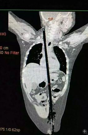 市兒童醫(yī)院組織專家團(tuán)隊對孩子的病情進(jìn)行檢查、評估后發(fā)現(xiàn),竹棍由患兒左側(cè)大腿根部插入,經(jīng)腹腔穿透胃、肝臟、膈肌入胸腔,并穿透患兒心臟,經(jīng)胸腔入頸部,此刻不能拔除竹棍,因為去除竹棍會導(dǎo)致心臟、肝臟破裂大出血導(dǎo)致休克,危及性命。