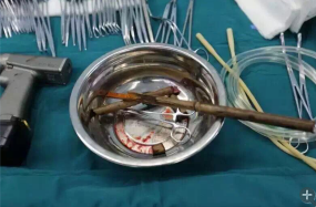 由于竹棍自心臟的右心房膈面穿入心臟,并由右房近左房頂處穿出心臟,經(jīng)右胸頂刺入右頸部,右心房破口處緊鄰右冠狀動脈,幸運的是胸腔內(nèi)大血管無損傷,在體外循環(huán)輔助下,醫(yī)護(hù)團(tuán)隊異物穿出處鋸斷異物,將插入心臟內(nèi)的竹棍截斷拔除,修補心臟破損處,向上繼續(xù)尋找周圍組織的游離異物,見異物緊臨頸部大血管,經(jīng)精細(xì)手術(shù),終于抽出了異物。整個手術(shù)時間花了十多個小時。