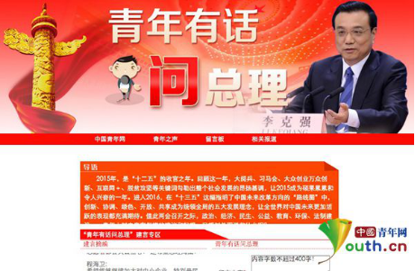圖為團(tuán)中央青年之聲平臺2016全國兩會“青年有話問總理”頁面。