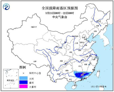 央廣網(wǎng)北京3月21日消息 據(jù)中國天氣網(wǎng)報(bào)道,中央氣象臺(tái)3月21日06時(shí)繼續(xù)發(fā)布暴雨藍(lán)色預(yù)警: