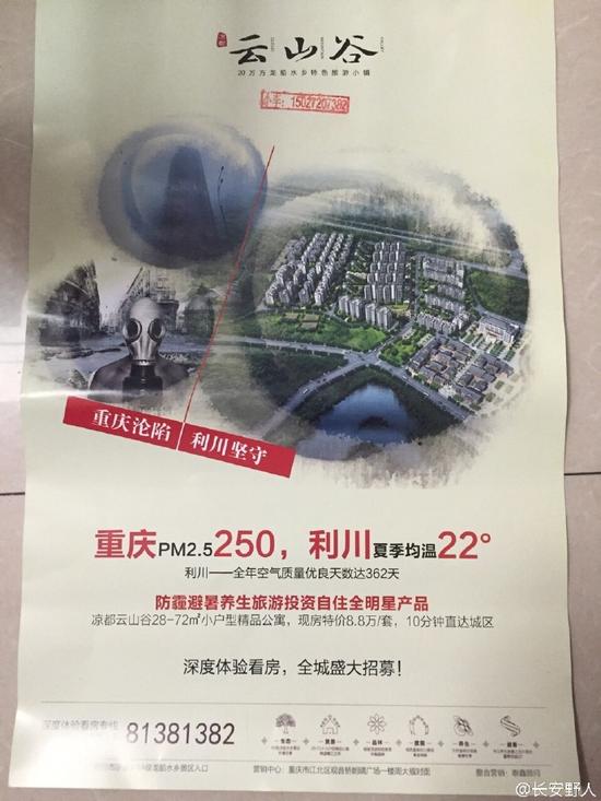 昨天中午,實(shí)名認(rèn)證為@@重慶市渝中區(qū)巴渝公益事業(yè)發(fā)展中心主任鄭建的網(wǎng)友,在微博上貼出一張利川一個(gè)樓盤(pán)的廣告單照片,頁(yè)面中心處“重慶淪陷,利川堅(jiān)守”八個(gè)字非常醒目,八個(gè)字下面還寫(xiě)著“重慶PM2.5 250,利川夏季均溫22℃,利川全年空氣質(zhì)量?jī)?yōu)良天數(shù)達(dá)362天”。其中,“重慶”和“250”的字體明顯放大,并改用更醒目的紅色。