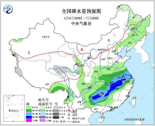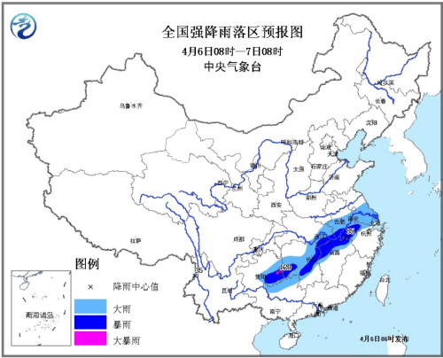 預計,6日08時至7日08時,湖北東部、安徽中南部、江蘇中南部、上海、浙江北部、江西北部、湖南中部和東北部、貴州東南部、廣西北部等地有大雨,其中,安徽南部、湖北東南部、江西北部、湖南中部和東北部、貴州東南部等地的部分地區(qū)有暴雨,局地大暴雨(100~120毫米);上述部分地區(qū)有短時強降水,最大小時雨強20~40毫米,局地伴有雷暴大風或冰雹。中央氣象臺4月6日06時繼續(xù)發(fā)布暴雨藍色預警。