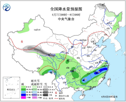 7日08時至8日08時,黑龍江西北部、吉林東南部、西藏北部、青海中南部等地有小到中雪或雨夾雪,局地有大雪;西藏東南部、云南西北部、川西高原北部、重慶西南部、貴州中北部、江南中南部、廣西東北部、廣東西北部等地的部分地區(qū)有中到大雨,其中浙江中部、江西東北部、廣西東北部等的局地有暴雨(50~70毫米)。內蒙古中東部、東北地區(qū)西部等地有4~6級風。南疆盆地有揚沙或浮塵。東海北部海域將有7~8級、陣風9級的西南風轉4~6級、陣風7級的西北風。