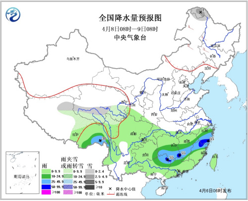 8日08時至9日08時,西藏北部、青海中南部、黑龍江西北部等地的部分地區(qū)有小雪(雨)或雨夾雪,局地有中雪;西藏東南部、云南西北部、貴州東南部、江南中南部、華南北部等地的部分地區(qū)有中到大雨,局地有暴雨(50~55毫米)。內蒙古中東部、東北地區(qū)西部等地有4~6級風。