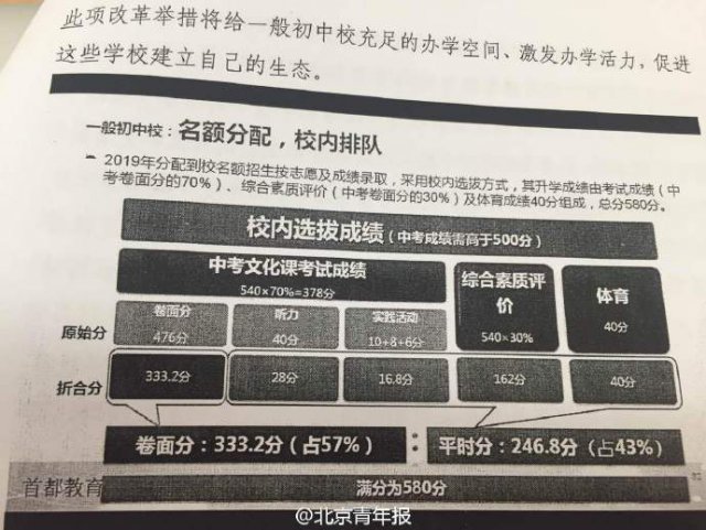 2019 年各校 50% 升入優(yōu)質(zhì)高中的機(jī)會(huì),什么樣的學(xué)生可以獲得?按照政策要求,學(xué)生的中考成績(jī)達(dá)到 500 分,且在同一學(xué)校具有連續(xù)三年學(xué)籍,才可參加 50% 優(yōu)質(zhì)高中的名額分配。將采取校內(nèi)選拔的方式,錄取成績(jī)?nèi)砸灾锌?580 分計(jì),由中考文化課成績(jī)、初中綜合素質(zhì)評(píng)價(jià)成績(jī)、體育成績(jī)組成,其中,中考文化課和初中綜合素質(zhì)評(píng)價(jià)成績(jī)滿分 540 分,按 7:3 比例計(jì)入,體育滿分為 40 分。(北青報(bào)記者 林艷 張昆龍)