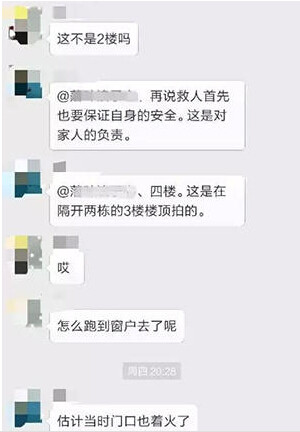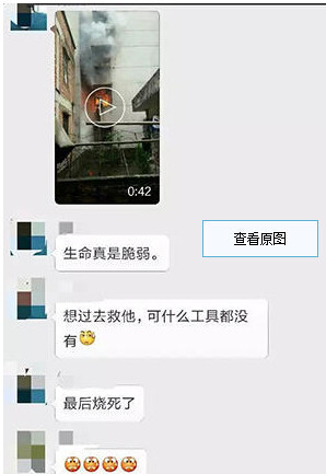 李先生(化名)描述,拍攝的時候他兩只腳都在抖,心里也很激動。在看到死者身上著火的時候他就沖下樓去,看看能不能幫上忙。樓下圍了好多人,一直都有砸門聲,他也幫不了。李先生(化名)表示,他沒有將視頻發(fā)到朋友圈,只是發(fā)到了一個同學(xué)群里,F(xiàn)在他的手機微信已經(jīng)被封號了,朋友給我截了當(dāng)時的圖。