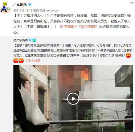 微信截圖顯示,在42秒視頻下方有三條李先生(化名)的訊息:“生命真是脆弱。想過去救他,可什么工具都沒有,最后燒死了!毕旅媸桥笥阉膫驚恐的表情包。發(fā)送時間在14日晚8點28分前。然而就是這個轉(zhuǎn)發(fā),把李先生推到了輿論的風(fēng)口浪尖,批評者、包括廣東消防微博認(rèn)為他殘酷冷血,不應(yīng)該這樣記錄拍攝他人的死亡。甚至警察也找上了門,查看了他的手機與視頻,要求他當(dāng)面刪除視頻,并錄下了口供。在民警離開后,他的微信就被封了號,到了第二天,網(wǎng)上出現(xiàn)了大量對他不利的言論。