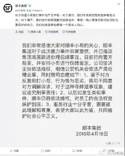 快遞員被扇耳光續(xù):順豐再聲明稱不同意對方調解訴求