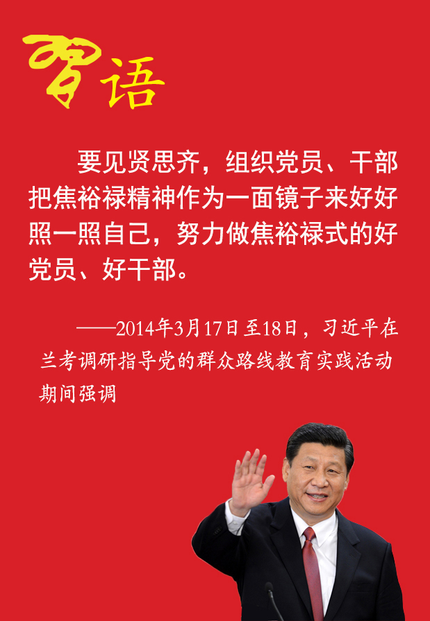2014年3月17日至18日,習(xí)近平在蘭考調(diào)研指導(dǎo)黨的群眾路線教育實(shí)踐活動(dòng)期間要求:“要見賢思齊,組織黨員、干部把焦裕祿精神作為一面鏡子來(lái)好好照一照自己,努力做焦裕祿式的好黨員、好干部!