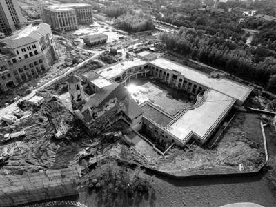 星漢北路金府鋼材城內(nèi),一座20多米高的建筑矗立在大片綠地中,尤為醒目。這座建筑由大廳和鐘樓組成,都是紅頂黃墻,主體結(jié)構(gòu)全部完工。在它背后,還藏著一座占地面積近9000平方米的下沉式廣場(chǎng),環(huán)形廊橋分上下兩層,中間留出空地。