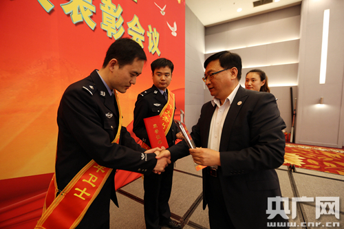 圖為北京鐵路公安局局長(zhǎng)王旭章為”十大杰出青年衛(wèi)士“頒獎(jiǎng)。
