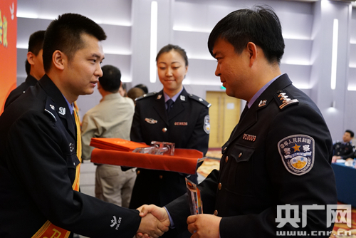 圖為北京鐵路公安局政治部主任姚勇為“十大杰出青年衛(wèi)士“頒獎(jiǎng)。