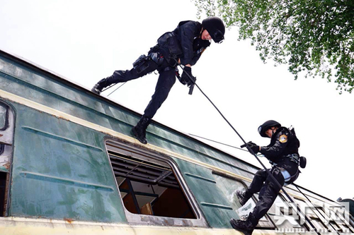 圖為十大杰出青年衛(wèi)士女特警隊(duì)員鮑金鳳在進(jìn)行車廂突入演練(左一)。